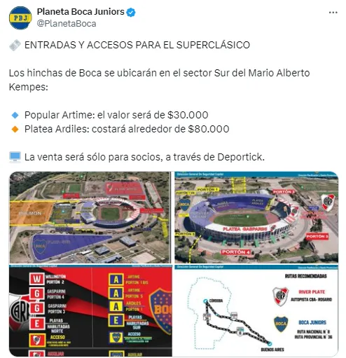 La venta será con prioridad para socios activos: el valor de la popular estará tasado en 30.000 pesos y el de la platea tiene un costo de 80.000 pesos. La hinchada del Xeneize se ubicará en el sur del Kempes.