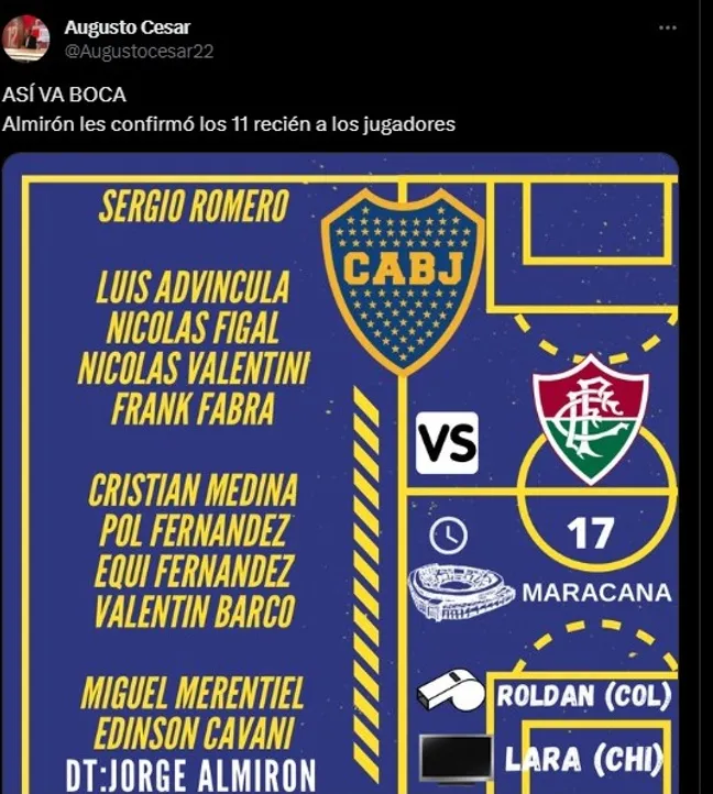 De esta manera, el xeneize saltará al Estadio Maracaná a las 17 horas de la Argentina con el siguiente once: Sergio Romero, Luis Advíncula, Nicolás Figal, Nicolás Valentini, Frank Fabra, Equi Fernández, Pol Fernández, Cristian Medina, Valentín Barco, Edinson Cavani y Miguel Merentiel.