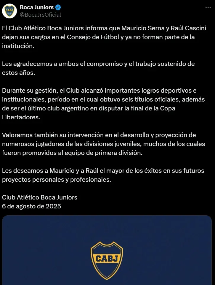 “El Club Atlético Boca Juniors informa que Mauricio Serna y Raúl Cascini dejan sus cargos en el Consejo de Fútbol y ya no forman parte de la institución.