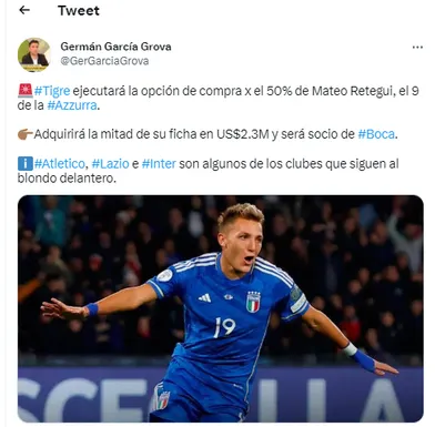 Boca es dueño de la totalidad del pase del delantero. Pero no por mucho tiempo: según reveló el periodista Germán García Grova, tras la actuación de Mateo en Italia “Tigre ejecutará la opción de compra por el 50%”. La misma está tasada en 2.300.000 dólares.
