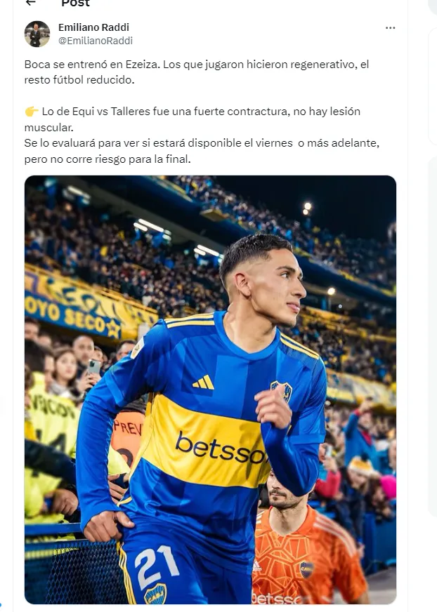 Por otra parte, el cronista que cubre la actualidad del Xeneize en el canal de televisión ESPN aseguró que al volante “se lo evualará para ver si está disponible este viernes o más adelante. Pero no corre riesgo para la final”. Esto ya tiene que ver con una postura que tomó Jorge Almirón ni bien se concretó la clasificación a la definición en el Maracaná.