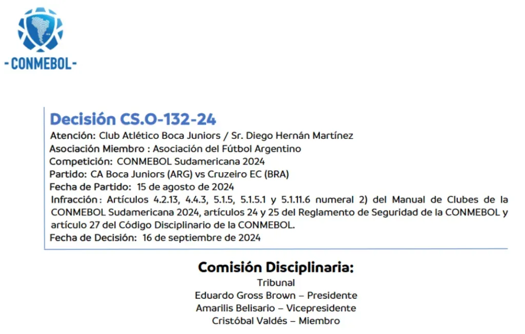 CONMEBOL le aclaró a Boca que, en caso de reiterarse cualquier infracción similar a la de este hecho, la Comisión Disciplinaria podrá determinar un cierre parcial o total del estadio para su siguiente partido en condición de local.
