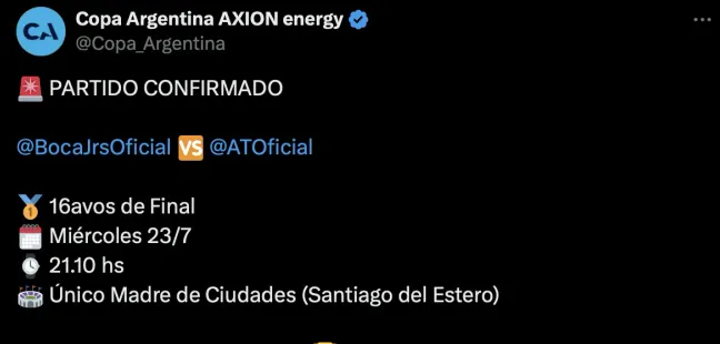 La cuenta oficial de la Copa Argentina subió a redes sociales la información oficial sobre el partido de Boca contra Atlético Tucumán por los 32avos de final. Y como se esperaba, el encuentro se va a estar dando el miércoles 23 de julio.