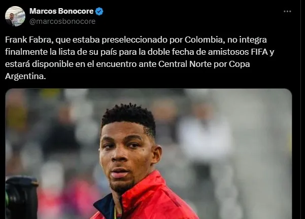 Frank Fabra podrá estar disponible para el debut de Boca en la Copa Argentina. El partido será el próximo sábado 23 de marzo (durante la fecha FIFA) ante Central Norte de Salta y, finalmente, el colombiano podrá estar a disposición de Diego Martínez. ¿Por qué era duda su aparición? El lateral integraba la prelista de la Selección de Colombia para la fecha FIFA de este mes.