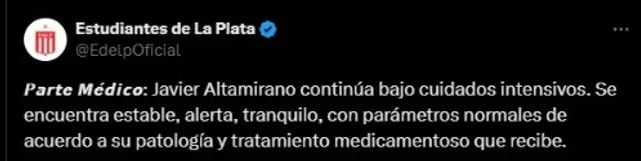 En las horas recientes, Estudiantes de La Plata sacó un nuevo comunicado sobre el estado de salud actual del volante chileno: “Javier Altamirano continúa bajo cuidados intensivos. Se encuentra estable, alerta, tranquilo, con parámetros normales de acuerdo a su patología y tratamiento medicamentoso que recibe“.