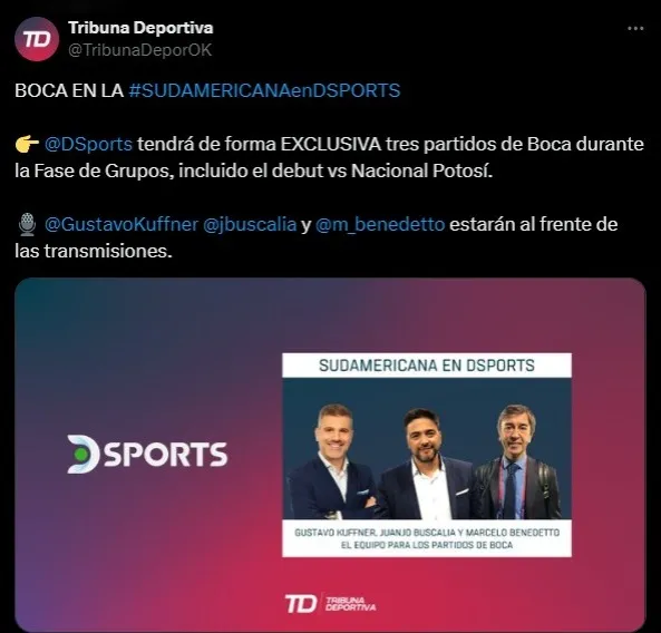Y es que, tras lo confirmado por Tribuna Deportiva en Twitter, se pudo conocer que el debut de Boca en la Copa Sudamericana ante Nacional Potosí se estará trasmitiendo exclusivamente por DSports, al igual que otros 2 partidos de la fase de grupos (a confirmar).