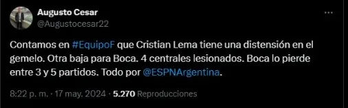 La información fue revelada por el periodista Augusto César, fuente que confirmó que Cristian Lema sufrió una distensión en el gemelo y será baja para Boca entre 3 y 5 partidos. ¿Los próximos rivales? Central Córdoba (Liga Profesional), Nacional Potosí (Copa Sudamericana), Talleres (Liga Profesional), Platense (Liga Profesional) y Vélez (Liga Profesional).