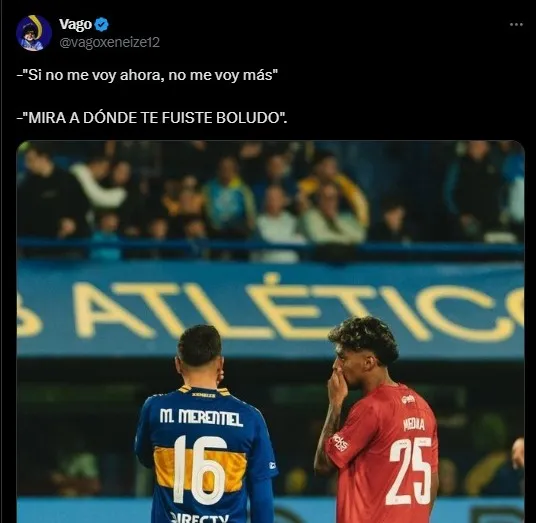Meses después, las vueltas de la vida situaron a Cristian Medina en Estudiantes de la Plata. Y antes del comienzo de segundo tiempo, el volante tuvo una charla con Merentiel en la mitad de la cancha. Momento que fue aprovechado por los hinchas para burlarse del jugador recordando aquel video viral: “Si no me voy ahora, no me voy más“, “MIRA A DÓNDE TE FUISTE BOLUDO“.