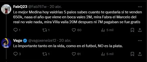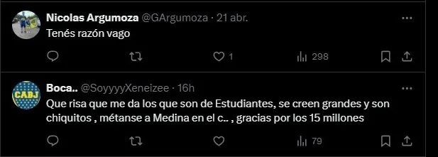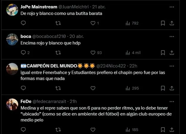 Si bien el volante dejó 15 millones de dólares, el hincha Xeneize parece no haberse olvidado la decisión de Medina no jugar cuando el equipo lo necesita. Situación que se dio ante Gimnasia de la Plata por Copa Argentina en 2024 con Fernando Gago, momento en donde el jugador pedía ser vendido al exterior.
