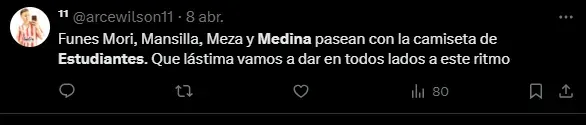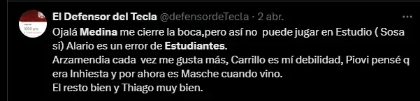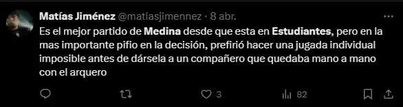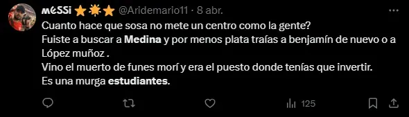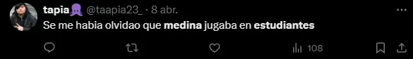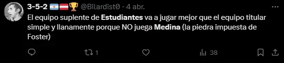 No son todos los fanáticos de Estudiantes que apuntan contra Cristian Medina ahora mismo, pero sí es verdad que el futbolista fue apuntado por una parte de los hinchas. “El equipo suplente va a jugar mejor porque no está Medina” y “Así no puede jugar en Estudiantes” son algunas de las opiniones en contra del volante.