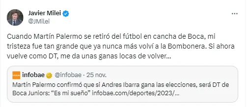 La política nacional tiene los ojos puestos en Boca. Javier Milei, Presidente electo de La Nación, tuiteó en apoyo a la lista opositora tras la confirmación de Martín Palermo como el DT de su proyecto: “Cuando Martín Palermo se retiró del fútbol en cancha de Boca, mi tristeza fue tan grande que ya nunca más volví a la Bombonera. Si ahora vuelve como DT, me da unas ganas locas de volver…“.