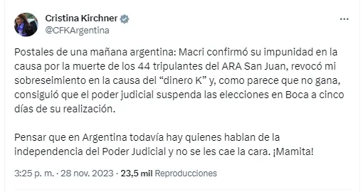 El tuit de Cristina y Boca tuvo que ver con una serie de noticias que se dieron a conocer durante las primeras horas del martes 28 de noviembre.“Postales de una mañana argentina: Macri confirmó su impunidad en la causa por la muerte de 44 triuplantes del ARA San Juan, revocó mi sobreseimiento en la causa del ‘dinero K’ y, como parece que no gana, consiguió que el poder judifical suspenda las elecciones en Boca a cinco días de su realización”, fue el mensaje completo de la expresidenta de la Nación (2007-2015) contra Macri.