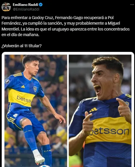 Se trata de Pol Fernández y Miguel Merentiel. El mediocampista había sido expulsado contra Riestra cerca del final del encuentro y el atacante se recuperó de una distensión que lo había dejado afuera de los últimos dos partidos. En base a cómo fueron los últimos partidos del mediocampo del Xeneize, no se descarta que Pol reaparezca entre los titulares.