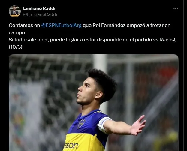 Y es que, según pudo informar Emiliano Raddi para Planeta Boca, el mediocampista pudo empezar a trotar en la práctica de este jueves y, si no tiene inconvenientes, la idea es que pueda estar disponible contra Racing el 10 de marzo en cancha de Boca.