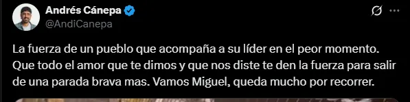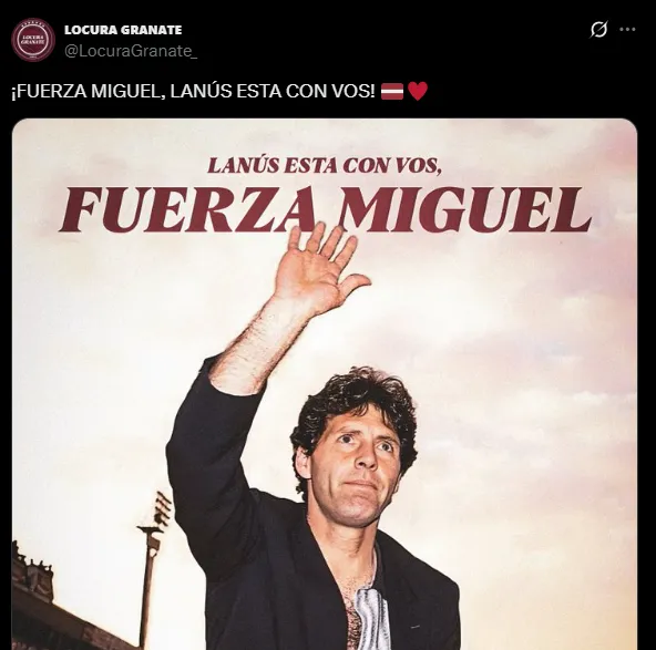 “Fuerzas Miguel, Lanús está con vos“, fue el mensaje de la cuenta ‘Locura Granate’. A su vez, el periodista Andrés Cánepa, que cubre a Rosario Central, hizo un emocionante posteo. “La fuerza de un pueblo que acompaña a su líder en el peor momento. Que todo el amor que te dimos y que nos diste te den la fuerza para salir de una parada brava más“, remarcó. A su vez, la cuenta de ‘Glorioso Azul’, que sigue el presente de Millonarios de Colombia, posteó: “Sonriendo, así siempre queremos ver a este inmenso ser humano“.