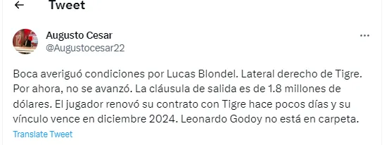 La misma, según indicó el periodista Augusto César, estaría tasada en 1.8 millones de dólares. Aunque quedará por ver qué negociarán Boca y Tigre, que también de por medio la compra de los de Victoria por el 50% de Mateo Retegui (cerca de 2.5 millones de dólares).