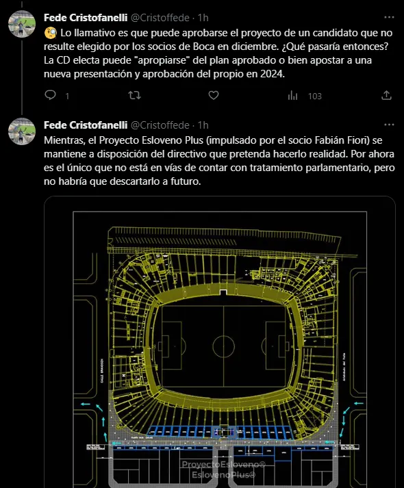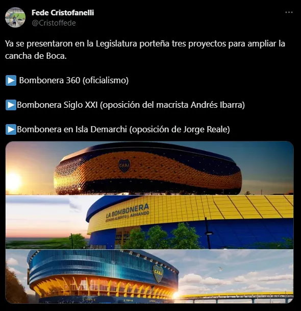 Los 4 proyectos mencionados son Bombonera 360 (impulsado por Jorge Amor Ameal, presidente actual), Bombonera en Isla Demarchi (propuesta por Jorge Reale, candidato opositor), Bombonera Siglo XXI (de Andrés Ibarra, candidato opositor) y Esloveno Plus (del socio Fabián Fiori). Los primeros tres ya fueron presentados ante la Legislatura Porteña.