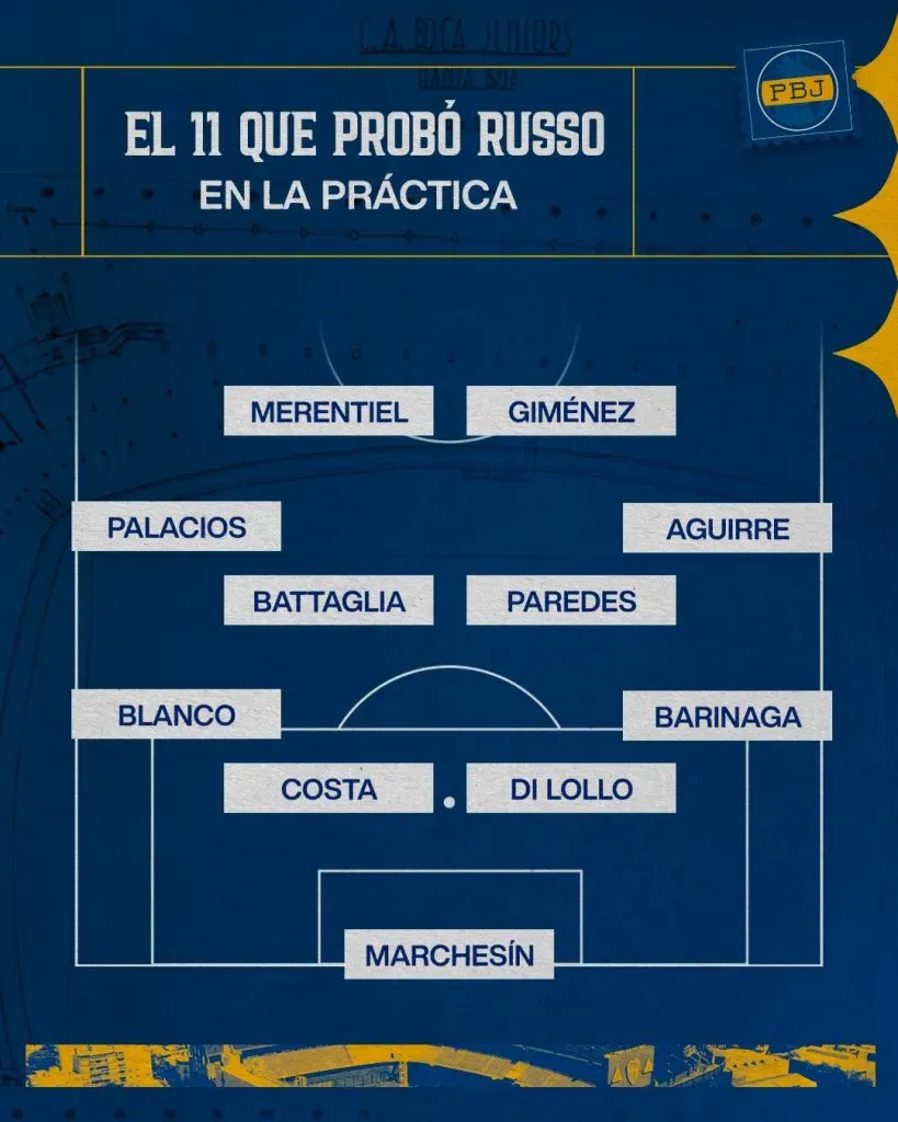 Con el uruguayo afuera, Russo rearmó el ataque Xeneize y los jugadores que formaron el equipo titular fueron: Agustín Marchesín; Juan Barinaga, Lautaro Di Lollo, Ayrton Costa, Lautaro Blanco, Brian Aguirre, Leandro Paredes, Rodrigo Battaglia, Carlos Palacios; Milton Giménez, Miguel Merentiel. De esta manera, el entrenador apuesta por los mismos nombres, con la única modificación de Giménez por Cavani.