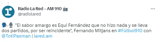 El presidente del Tribunal de Discilpina sorprendió con su apreciación sobre Ezequiel Fernández, quien fue elegido por Darío Herrera en el revoleo de tarjetas rojas pero quedó comprobado que no hizo nada. El volante ya había sido expulsado ante Vélez y, por reincidencia, fue sancionado con dos fechas de suspensión. “El sabor amargo es Equi Fernández que no hizo nada y se lleva dos partidos, por ser reincidente”, cerró Mitjans.