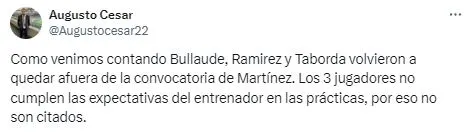 Boca viajará próximamente a Paraguay para jugar ante Sportivo Trinidense y en la lista de convocados hay ausentes como Marcos Rojo y Darío Benedetto. Pero no son los únicos. Ezequiel Bullaude, Juan Ramírez y Vicente Taborda tampoco fueron citados por Diego Martínez pese a no tener ninguna lesión. El periodista Augusto César se refirió a estos casos tan particulares y dio a conocer el motivo de la decisión del DT.