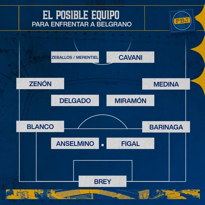 Según informó el periodista Augusto César en ESPN F12, este es el posible equipo de Boca para el partido contra Belgrano: Leandro Brey; Juan Barinaga, Nicolás Figal, Aaron Anselmino, Lautaro Blanco, Cristian Medina, Ignacio Miramón, Milton Delgado, Kevin Zenón; Edinson Cavani y Miguel Merentiel/Exequiel Zeballos.