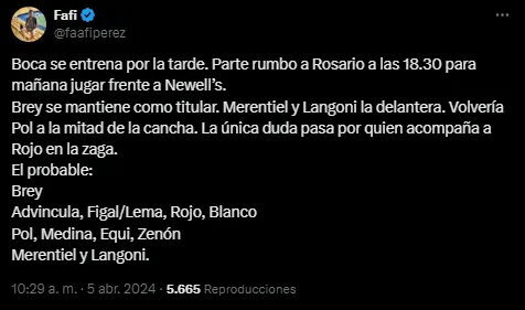 En cuanto al mediocampo, habría un regreso importante para el 11 titular. Pol Fernández iría de arranque, según reveló el periodista Facundo Pérez de DSports. Junto a él estarían Equi Fernández, Cristian Medina y Kevin Zenón. El volante ya tuvo minutos frente a San Lorenzo pero este sería su primer encuentro desde el inicio desde su lesión frente a Central Córdoba en La Bombonera.