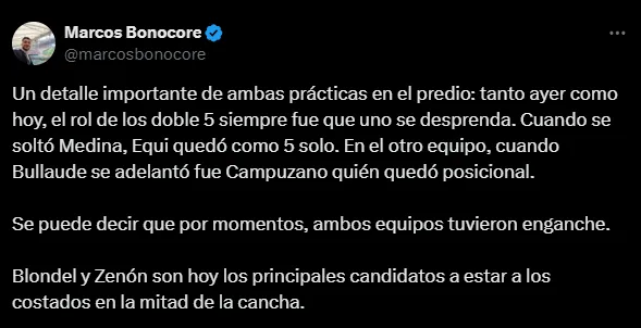 Según informó el periodista Marcos Bonocore en su cuenta de Twitter, “el rol de los doble 5 siempre fue que uno se desprenda“. Es decir en el segundo equipo cuando Cristian Medina jugó suelto, Ezequiel Fernández quedó como único mediocampista central.