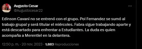 No obstante, esta no es la única noticia que se dio respecto al cruce contra los de La Plata. Valentín Barco, juvenil que en la práctica del domingo salió reemplazado por precuación, se realizó estudios en esta mañana de lunes y se descartó que tenga alguna lesión muscular por lo que estará disponible para el partido.
