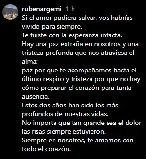 “Estos dos años han sido los más profundos de nuestras vidas. No importa que tan grande sea el dolor, las risas siempre estuvieron. Siempre en nosotros, te amamos con todo el corazón“, menciona otro fragmento del posteo. La publicación tuvo muchísimos comentarios, con agradecimiento por sus enseñanzas, y las condolencias hacia sus amigos y familiares.