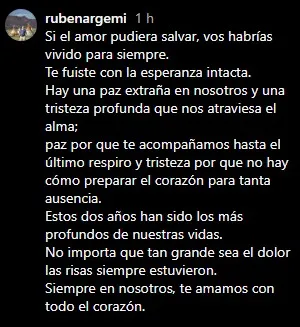 Así como el doctor de la institución lo despidió con una imagen, en la cuenta personal de Argemi lo recordaron con un emotivo mensaje: “Si el amor pudiera salvar, vos habrías vivido para siempre. Te fuiste con la esperanza intacta. Hay una paz extraña en nosotros y una tristeza profunda que nos atraviesa el alma. Paz porque te acompañamos hasta el último respiro y tristeza porque no hay cómo preparar el corazón para tanta ausencia”.