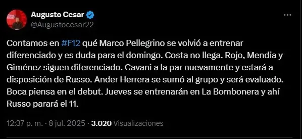 El periodista Augusto César contó en ESPN las últimas novedades sobre la práctica de Boca de este martes a la mañana. Y las dos buenas noticias tienen que ver con que Edinson Cavani y Ander Herrera se entrenaron a la par del grupo. Esto, después de que ambos jugadores dejen atrás sus lesiones que trajeron del Mundial de Clubes.