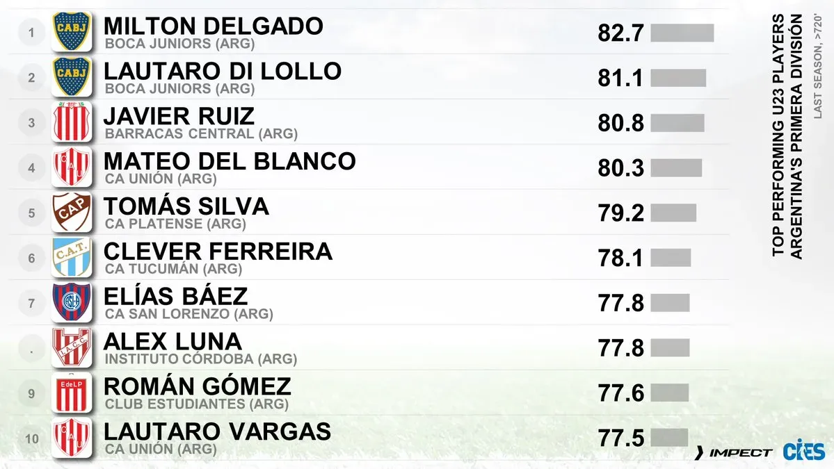 De acuerdo a una valoración máxima de 100, el volante fue el mejor puntuado con una marca de 82.7, seguido por el zaguero central con 81.1. El que completa el podio es Javier Ruiz, una de las joyas que se destacó en Barracas Central y cuyo pase pertenece a Independiente, con 80.8. Acá abajo, el Top 10 completo.