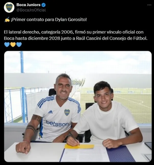 Dylan Gorosito firmó su primer contrato con Boca Juniors. A través de un comunicado oficial del club, se dio a conocer la noticia de que el juvenil categoría 2006 es nuevo jugador profesional del club de la Ribera hasta diciembre del 2028.