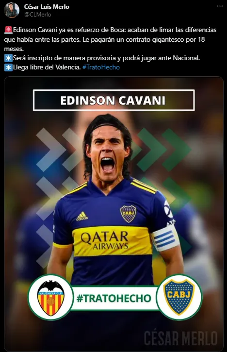 Así lo informó el periodista César Merlo: “Edinson Cavani ya es refuerzo de Boca: acaban de limar las diferencias que había entre las partes. Le pagarán un contrato gigantesco por 18 meses. Será inscripto de manera provisoria y podrá jugar ante Nacional. Llega libre del Valencia. #TratoHecho”.