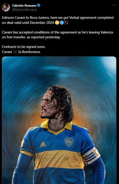 Por su parte, el cronista italiano Fabrizio Romano, experto en el mercado de pases a nivel mundial, fue por la misma línea. “Edinson Cavani a Boca Juniors, ¡aquí vamos! Completado el acuerdo verbal para un contrato hasta diciembre de 2024. Cavani aceptó las condiciones del acuerdo para irse del Valencia gratis, como se reportó el jueves. Los contratos se firmarán pronto. Cavani, a la Bombonera”, sostuvo. ¡El pase del año ya es una realidad!