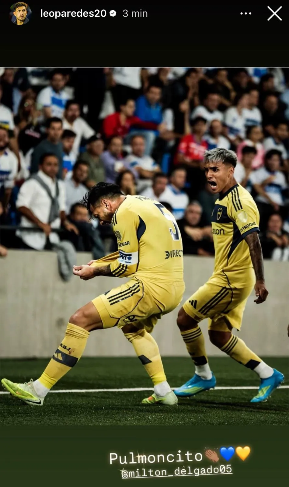 En su cuenta de Instagram, Paredes subió una historia del festejo de gol junto con el joven futbolista. Allí le escribió lo que parece ser el sobrenombre que tiene dentro del vestuario y que demuestra la importancia del juvenil en el equipo.