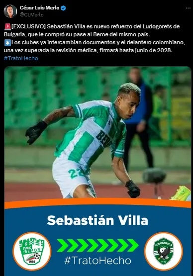 Sebastián Villa jugará en el Ludogorets de Bulgaria, uno de los mejores del país y clasificado a la próxima Champions League, según reveló el periodista César Merlo de TyC Sports. El ex jugador del Xeneize firmará contrato por cuatro temporadas tras su breve paso por el Beroe.