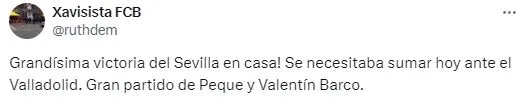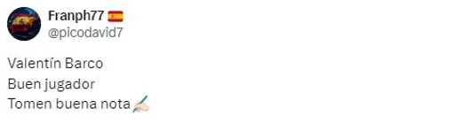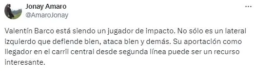 Por la séptima fecha de La Liga, el Colo fue titular en el partido ante Real Valladolid y que culminó con victoria por 2-1. En lo que fue su cuarta aparición con esta institución, se destacó de gran manera a tal punto que generó todo tipo de comentarios en las redes sociales. En “X” (Twitter), los simpatizantes aprobaron su rendimiento. “Gran partido de Valentín Barco” o “Valentín Barco está siendo un jugador de impacto”, fueron algunos de los comentarios.