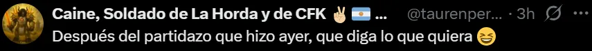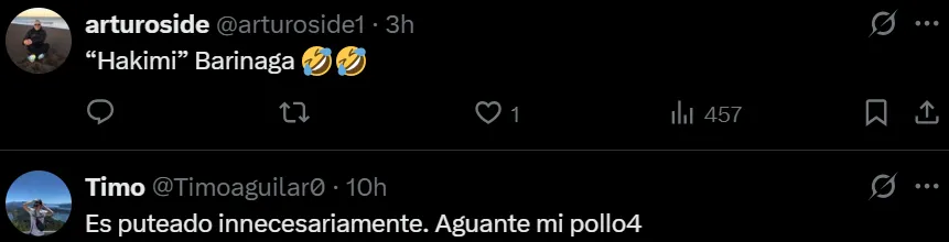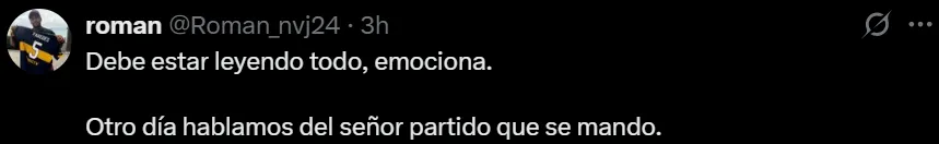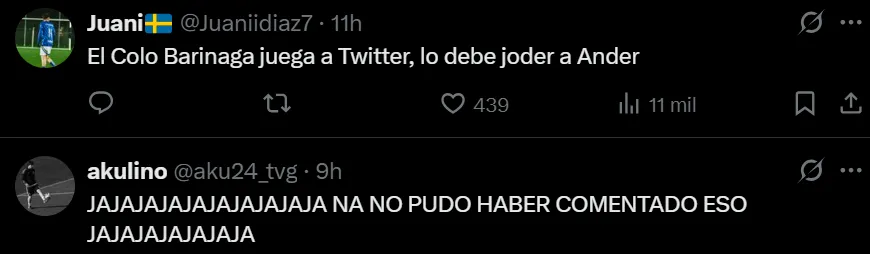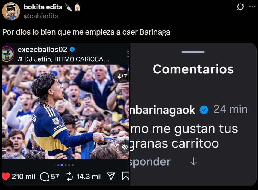“Por dios lo bien que me empieza a caer Barinaga”, “El 4 para la Copa, me subí con el partido de hoy”, “Tus filigranas, es uno de los nuestros”, fueron algunos de los comentarios que los fanáticos hicieron sobre el ‘Colo’ y su frase en la publicación de Zeballos. A su vez, otro detalle que enloqueció a los hinchas, fue la cercanía del lateral con X (ex Twitter).