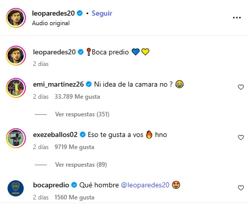 La respuesta de Paredes no se hizo esperar y le puso emojis de risas a las palabras que su compañero puso en el posteo. Sin dudas, hay una muy buena relación entre todos los campeones del mundo y por eso no sorprenden los comentarios que van apareciendo en las publicaciones de Instagram.