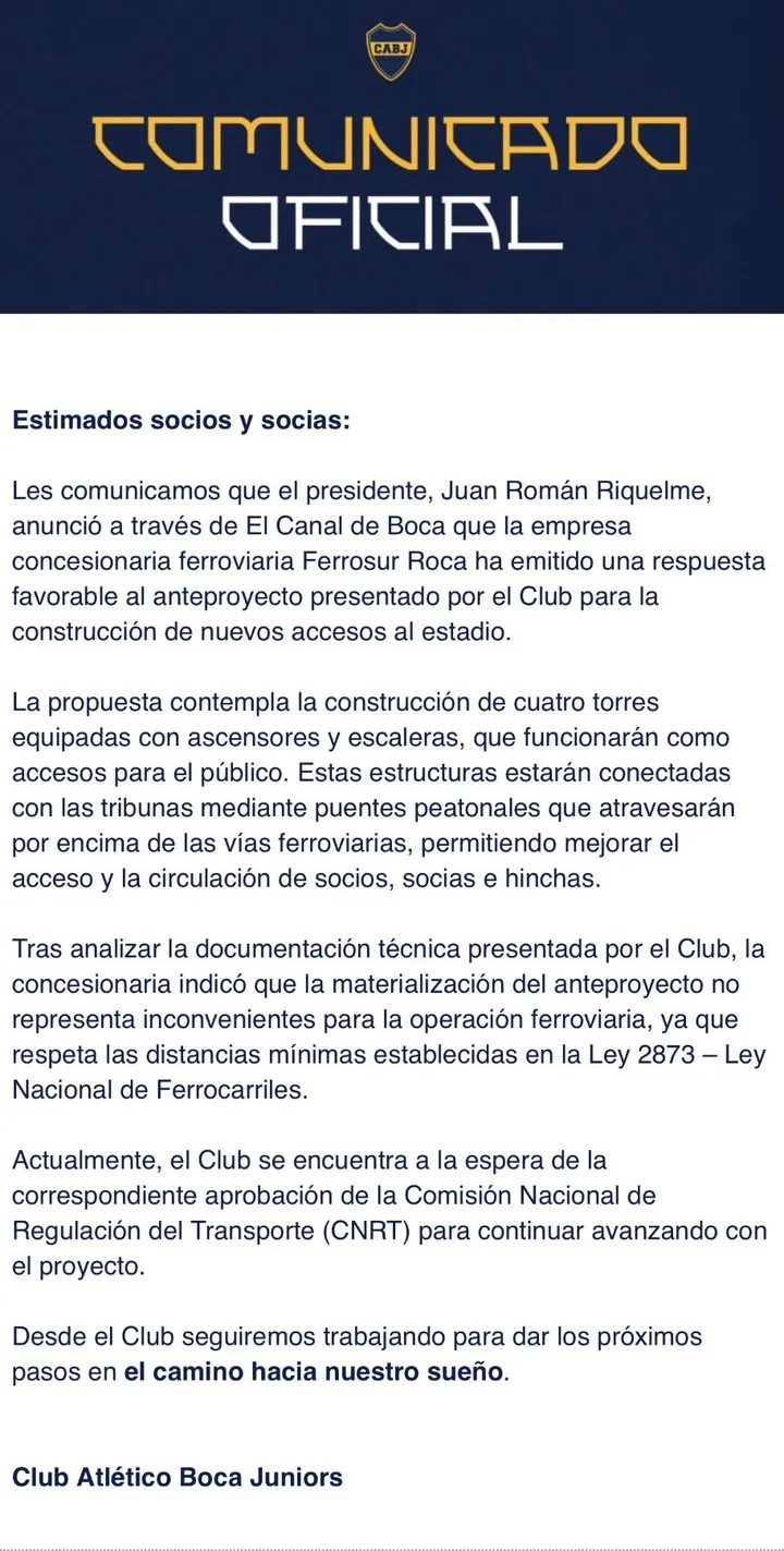 Les comunicamos que el presidente, Juan Román Riquelme, anunció a través de El Canal de Boca que la empresa concesionaria ferroviaria Ferrosur Roca ha emitido una respuesta favorable al anteproyecto presentado por el Club para la construcción de nuevos accesos al estadio.
