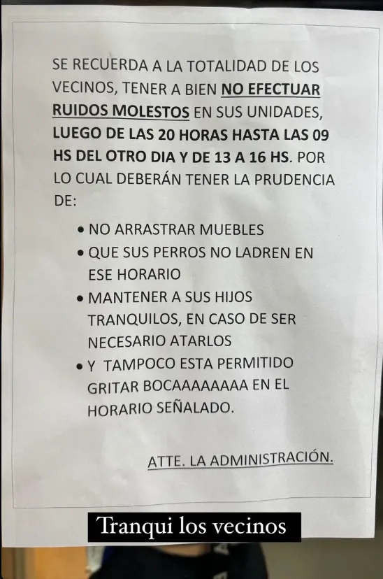 “Tranqui los vecinos“, publicó la usuaria de TikTok @barbiesj donde mostró una serie de pedidos de la administración pegados en el ascensor. El mismo habla de “no efectuar ruidos molestos luego de las 20 horas hasta las 09 del otro día“. Pero después se puso un poco más específico.