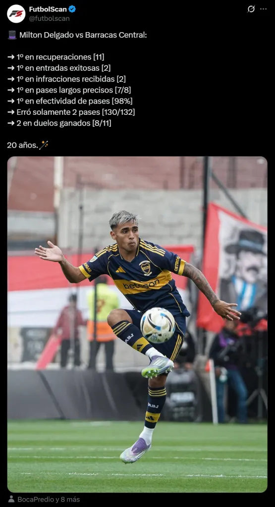 Según reveló la cuenta de X (Twitter) FútbolScan, Delgado fue el más preciso de Boca en cuanto a los pases. El juvenil registró un 98% de eficacia a la hora de jugar la pelota, algo que se traduce en 2 pases errados sobre 132 que realizó en todo el encuentro.