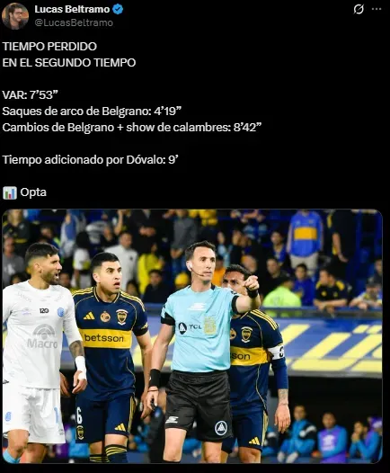 Algo que no se sabía hasta ahora es el cálculo del tiempo añadido en el segundo tiempo, que fue de 9 minutos pero el encuentro estuvo detenido mucho más. Los chequeos de VAR demoraron casi 8 minutos del complemento, las demoras en saques de arco poco más de 4 minutos y los cambios sumados a jugadores rivales en el piso “acalambrados” dieron casi 9 minutos.