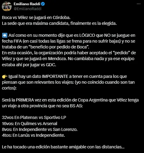 Boca enfrentará a Vélez por la semifinal de la Copa Argentina el miércoles 27 de noviembre a las 21.10 en Córdoba. La organización ya confirmó la fecha y la sede y los del Fortín se quejaron por ambos elementos. Hubo una puja durante semanas por el día en el que se debía disputar, ya que desde Liniers pedían que fuera en esta fecha FIFA y en el Xeneize pretendían que fuera después.