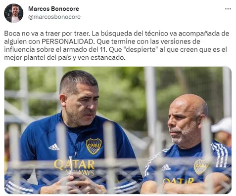 Una de las primeras ideas del vicepresidente es traer alguien que no sea del riñón del club y ahora se supo otro dato interesante. “La búsqueda del técnico va acompañada de alguien con personalidad. Que termine con las versiones de influencia sobre el armado del 11. Que “despierte” al que creen que es el mejor plantel del país y ven estancado“, indicó el periodista Marcos Bonocore.
