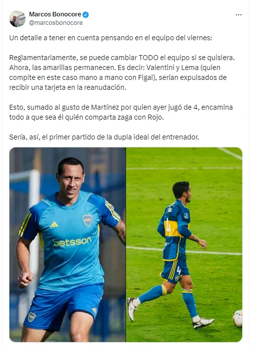 En poco más de 20 minutos de jugo, Boca ya tenía a sus dos defensores centrales amonestados. Tanto Cristian Lema como Nicolás Valentini vieron la tarjeta amarilla y la misma se mantiene en la renaudación del partido. Pero el DT corregirá ese aspecto: ninguno de los 2 sería titular.