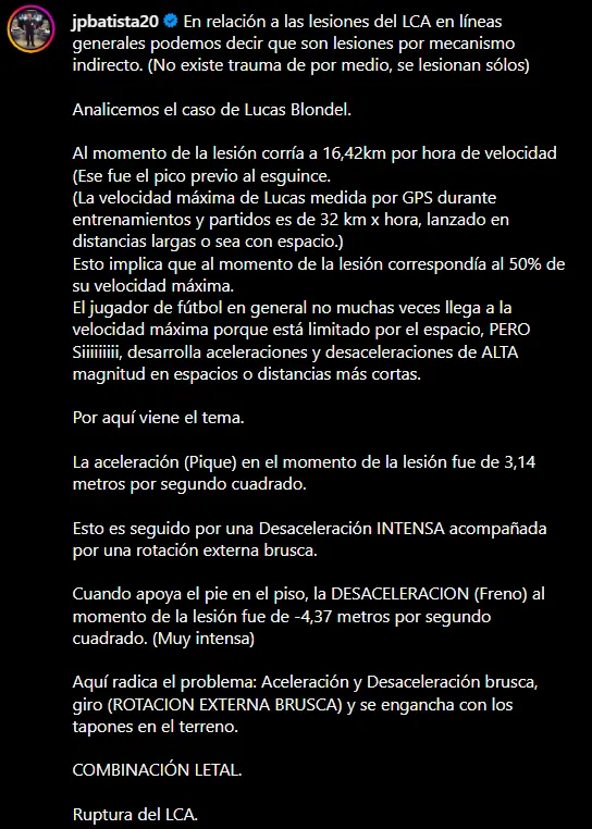 Previo a este posteo, el Doctor Batista ya se había referido en sus redes sociales a la lesión de Lucas Blondel y habló sobre el panorama de las constantes roturas de ligamentos que hay en el fútbol argentino.