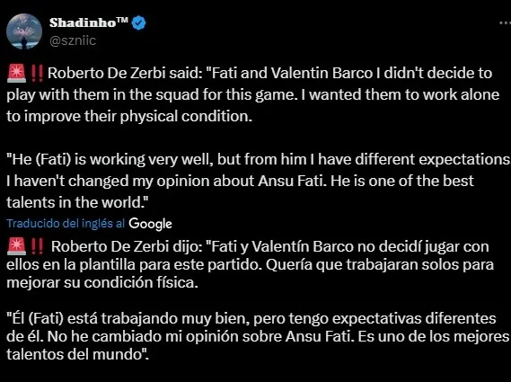 En el post partido de Brighton vs. Brentford, Roberto de Zerbi se tomó el tiempo de analizar el encuentro y dio los motivos por los que Barco no fue ni siquiera citado: “Yo decidí que tanto Ansu (Fati) como Valentín (Barco) no formaran parte de la plantilla para este partido. Tienen que trabajar para mejorar su condición física“.