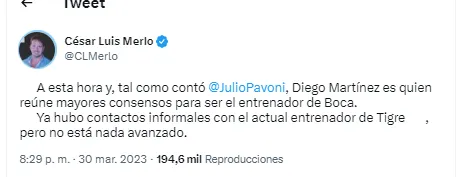 Según contó el periodista César Luis Merlo en conjunto con Julio Pavoni “Diego Martínez es quien reúne mayores consensos para entrenador de Boca”. Y agregó que ya hubo contactos informales con el actual entrenador de Tigre pero “no está nada avanzado”.